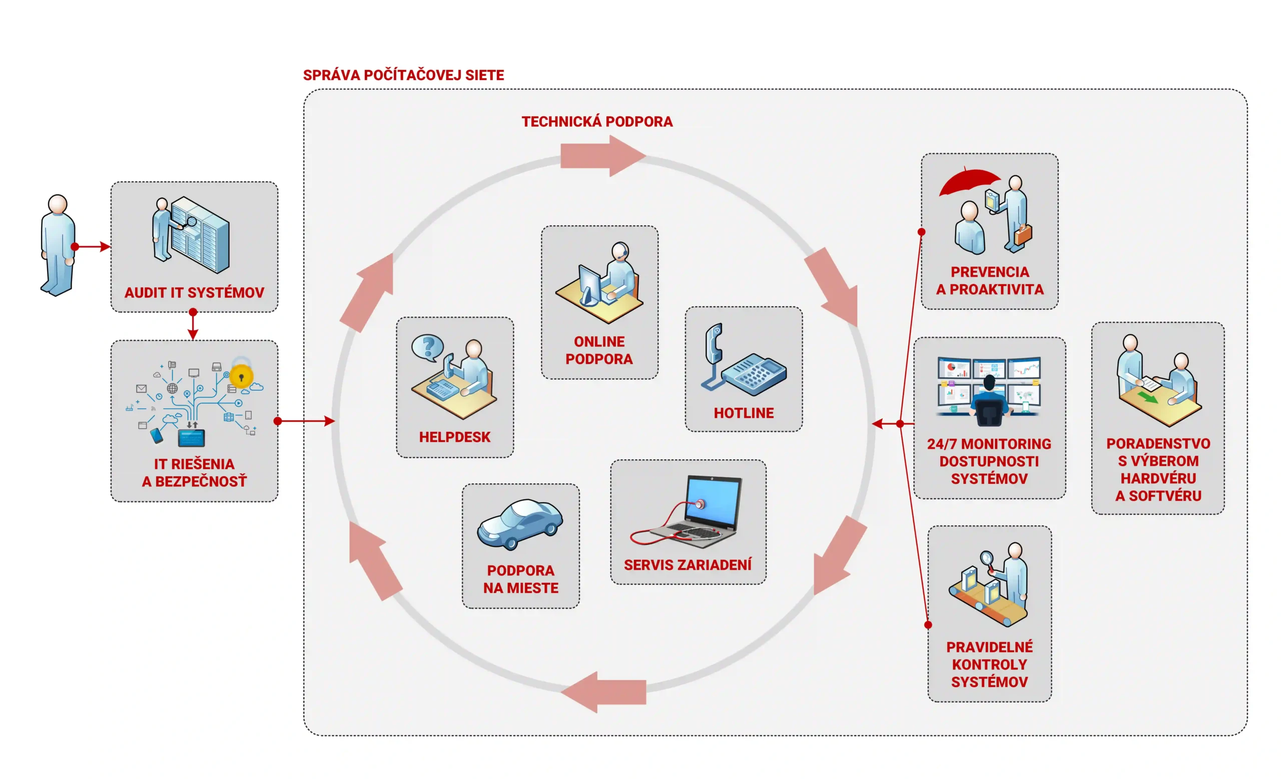 Či už ste malá firma s veľkými cieľmi alebo veľká firma, ktorá chce ešte viac napredovať, sme tu pre Vás nielen s našimi službami pri správe siete, ale aj s profesionálnymi komplexnými riešeniami na mieru, ktoré Vám pomôžu zvýšiť efektivitu a bezpečnosť Vášho IT.